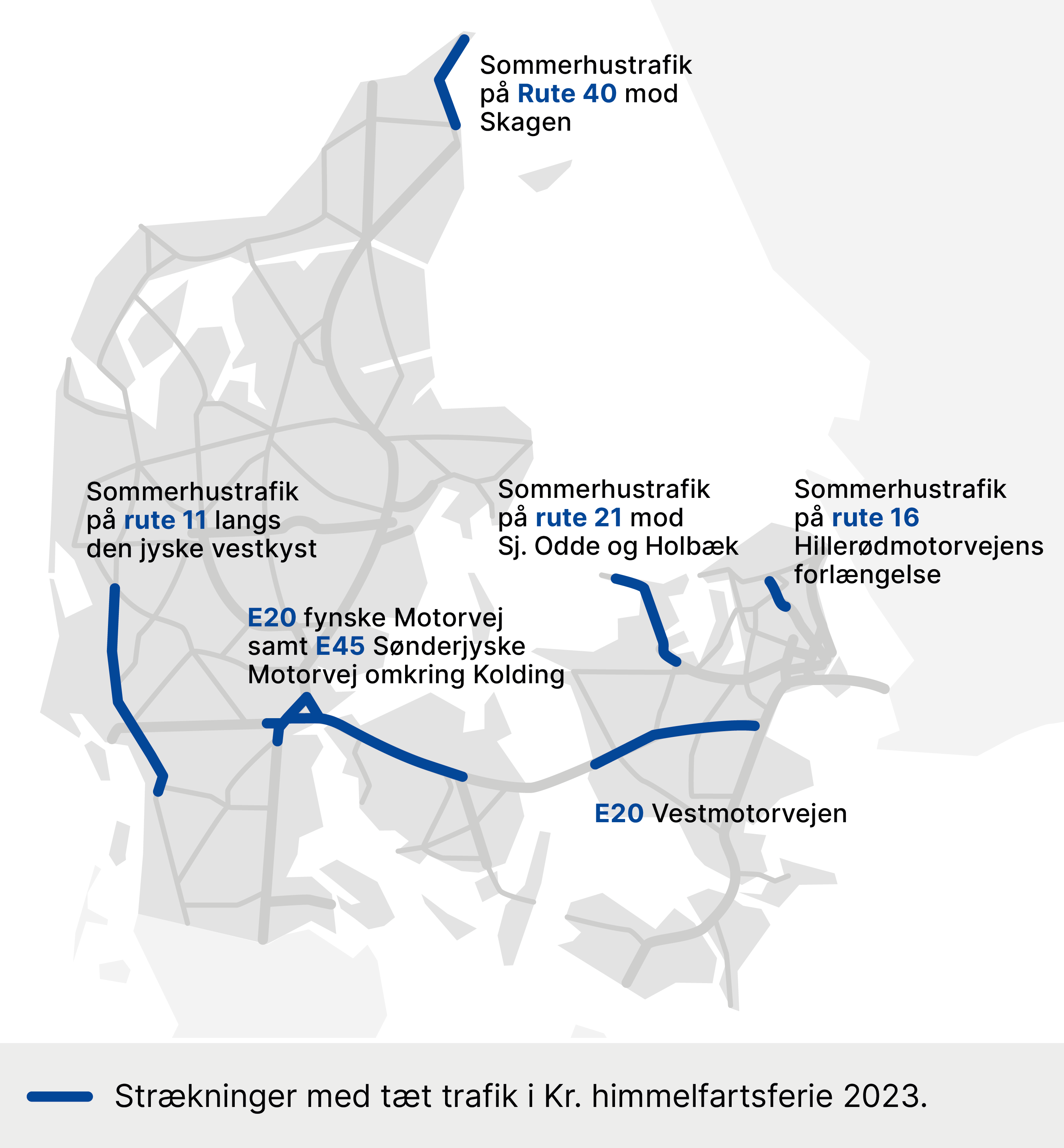 Trafikken vil på disse dage hovedsageligt bevæge sig fra hovedstadsområdet mod Jylland. Det sker via Fyn og Sjællands Odde. Der er også risiko for tæt trafik på E45 Sønderjyske Motorvej omkring Kolding.